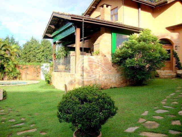 Casa no Miolo da Granja Vianna, hall, porta em madeira com duas folhas e vidro, living para três ambientes, sala de estar, sala de jantar, sala de lareira, pisos em cerâmica, forro em lambri e vigas aparente, lareira revestida em pedra goiaís, portas envidraçadas, lavabo pia em mármore e cuba em metal embutida, acesso ao nível superior escadas em concreto revestidos em madeira, guarda corpo em ferro, mezanino, corredor de circulação, três dormitórios todos suites, pisos cerâmico, armários, banheiros com azulejos até o teto, frisos decorativos, pias em lamina de granito e gabinete, box com porta de vidro transparente, suite casal, closet, hidromassagem, cozinha com azulejos até o teto, sancas de gesso decorado, armários planejados, exaustor em inox escovado, despensa, lavanderia, dependência de empregada, área de lazer coberta, varanda, churrasqueira tradicional em tijolo aparente, piscina com bordas em pedra goiaís, quintal e jardim gramado arborizado com paisagismo, portão automatizado, garagem coberta para dois automóveis.