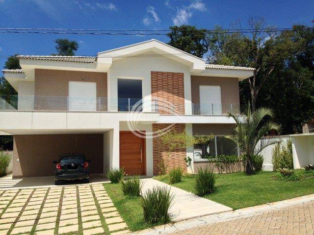 Casa em condomínio, living com pé direito alto, para três ambientes, sala de estar, sala de jantar, sala de lareira, janelas e painéis envidraçado, piso em porcelanato fosco, iluminações centralizadas, lareira elétrica revestida em mármore rústico, lavabo pia em mármore travertino, acesso ao segundo piso, escadas em concreto revestidas mármore travertino rústico, corredor de circulação, quatro dormitórios todos suítes, pisos em tacão de madeira, iluminações centralizadas, banheiros com pias em silestone cubas sobrepostas, box revestidos em azulejos, suíte casal pia com duas cubas Ele Ela, hidromassagem, porta balcão envidraçada e sacada cozinha, pia em granito com duas cubas de inox, lavanderia, dependência d e empregada, área de lazer com piscina raia, deck de madeira, churrasqueira, nível inferior, salão de festas, academia, atelier, quintal e jardim gramado, entrada lateral, garagem coberta paradois automóveis.